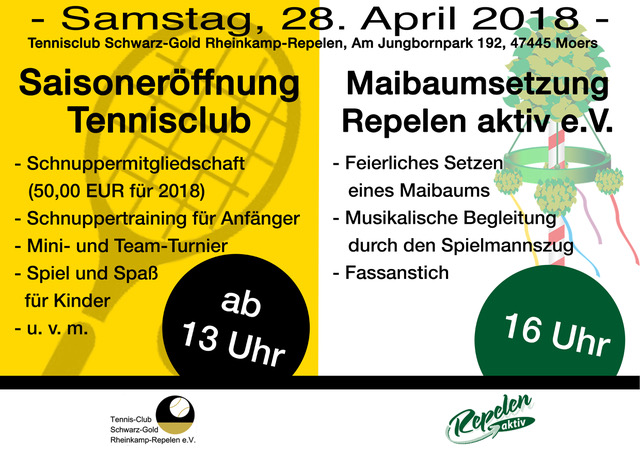 Unter dem Motto „Öfter mal etwas Neues“ und im Sinne der „Brauchtumspflege“ wird „Repelen aktiv e.V.“ zusammen mit dem „Tennisclub Schwarz-Gold Rheinkamp-Repelen e.V.“ am 28. April 2018 ab 16:00 Uhr einen Maibaum aufstellen.