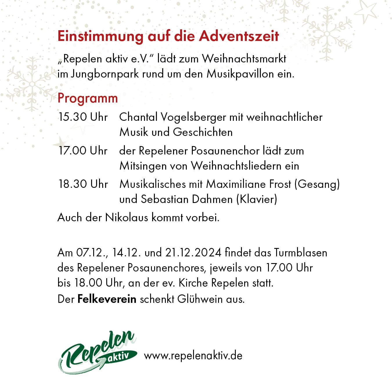 Der Verein „Repelen aktiv“ lädt in Zusammenarbeit mit den Kirchengemeinden aus Moers-Repelen, vielen Vereinen, Schulen und den Kindertagesstätten zum Weihnachtsmarkt im Jungbornpark, rund um den Musikpavillon, ein. Am Samstag, den 02.12.2023 erwartet die Besucher ab 14.00 Uhr ein Weihnachtsmarkt der etwas anderen Art.